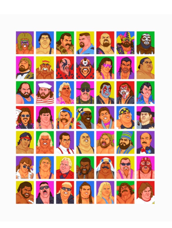 Signed, Open edition print of Slampros , 16x20( portrait layout) featuring 49 wrestler portraits. Printed with archival ink on photo paper.